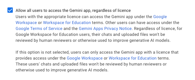 Z toho odkazu na „qualifying edition“ nejsem vůbec moudrý. V admin rozhraní Workspace je pak ohledně Gemini tenhle checkbox: