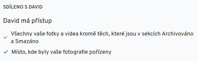 Partnerské sdílení je blízko tomu, co chceme, ale podle dokumentace se nevztahuje na rozpoznané obličeje, takže by pro nás nefungovalo dobře.